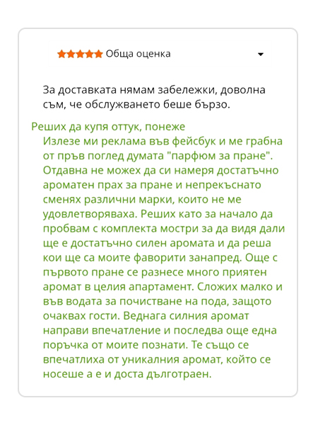 Поставяме качеството на първо място. При създаването на парфюмите обръщаме специално внимание на интензивността на аромата и дълготрайността му.
