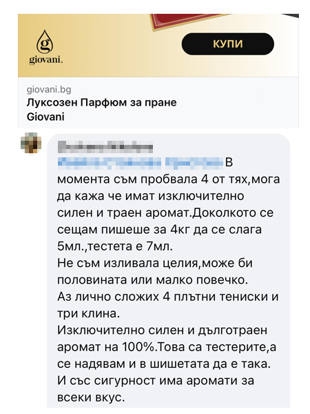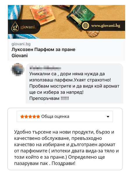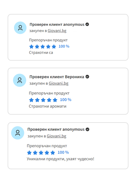 Giovani® е луксозна парфюмерийна марка. В момента присъстваме в държави от ЕС и имаме над 1,6 милиона доволни клиенти. Нашите продукти дългосрочно получават оценки над 99%. Носители сме на наградите „Продукт на годината 2024“ и „Онлайн магазин на годината 2024“.