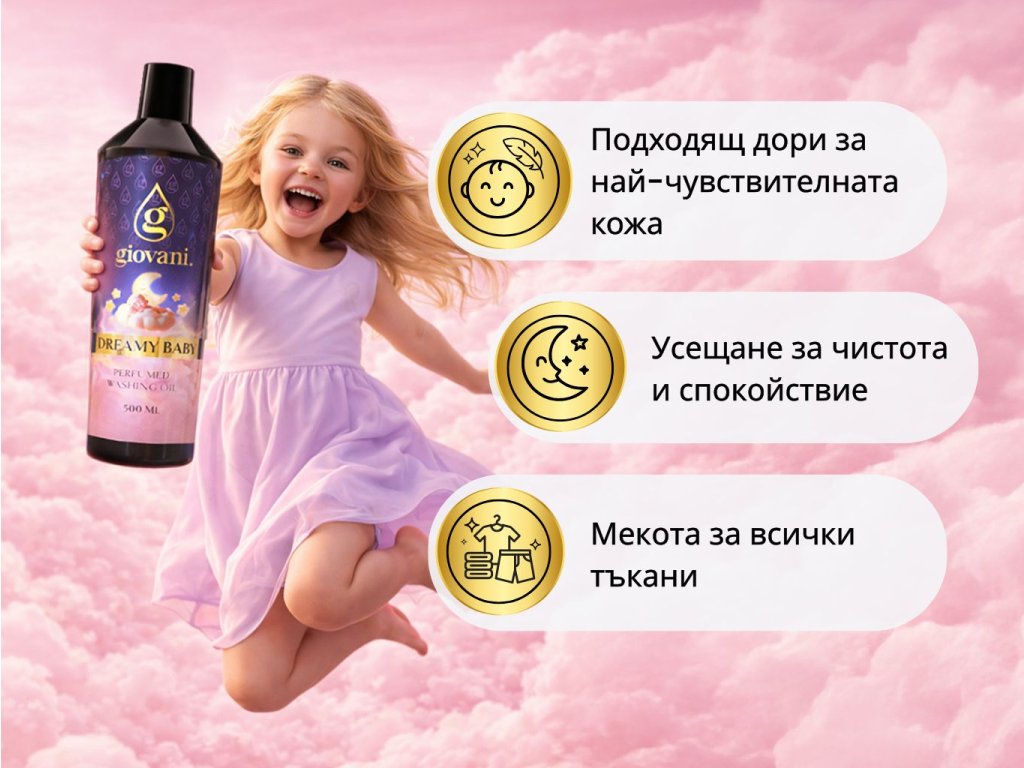 Ароматните есенции на парфюма за пране Giovani® DREAMY BABY са флорално-пудрови с нотка свежест. Освежаващите зелени нотки и бергамот отварят пътя към нежното сърце на аромата, в което се преплитат портокалов цвят, роза, жасмин, виолетка и перуански хелиотроп. Основата е съставена от кадифен мускус, кремообразна ванилия и топъл сандалово дърво. Тази хармонична композиция радва сетивата и същевременно е щадяща дори към най-чувствителната кожа.