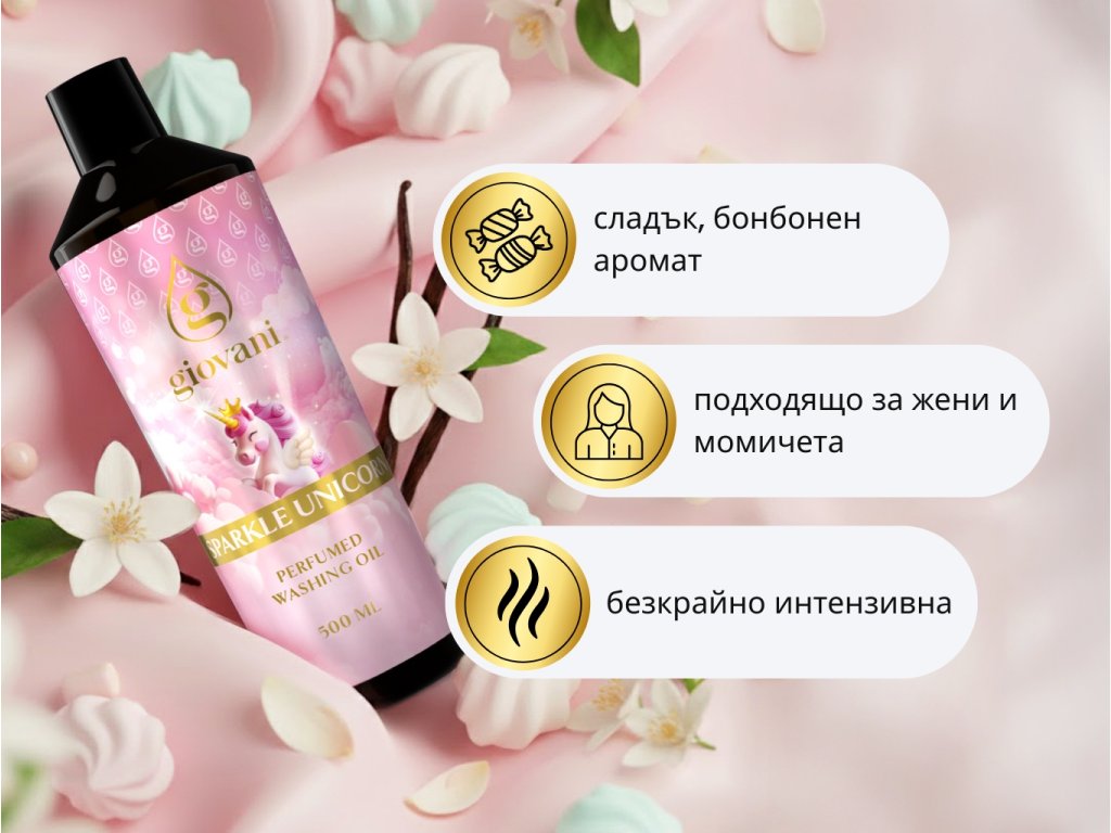 Парфюмът за пране SPARKLE UNICORN е като вход към свят на фантазия, в който всичко е розово, сладко и блестящо. Интензивният му тон напомня бонбонена мечта и онова прекрасно усещане, когато се сгушиш в мека пухкава завивка. Предназначен е за жени и момичета, които обожават игриви и сладки аромати, оставящи вкусна и неповторима следа.