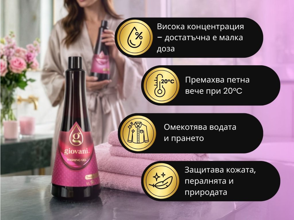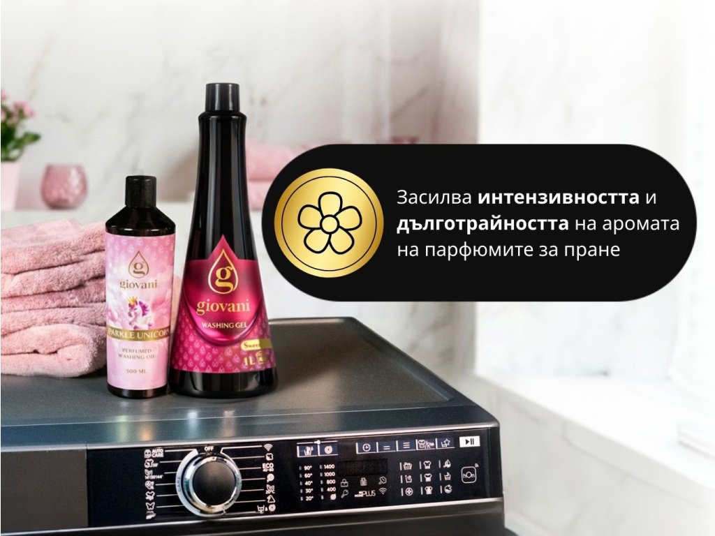 Прането вече не трябва да е просто досадно задължение. С перилния гел Giovani® SWEET, то се превръща в приятен ритуал на чистота и свежест. Този силно концентриран гел с нежен, но дълготраен сладко-свеж цветен аромат прониква дълбоко в тъканите и оставя неустоимо усещане за чистота и хармония.